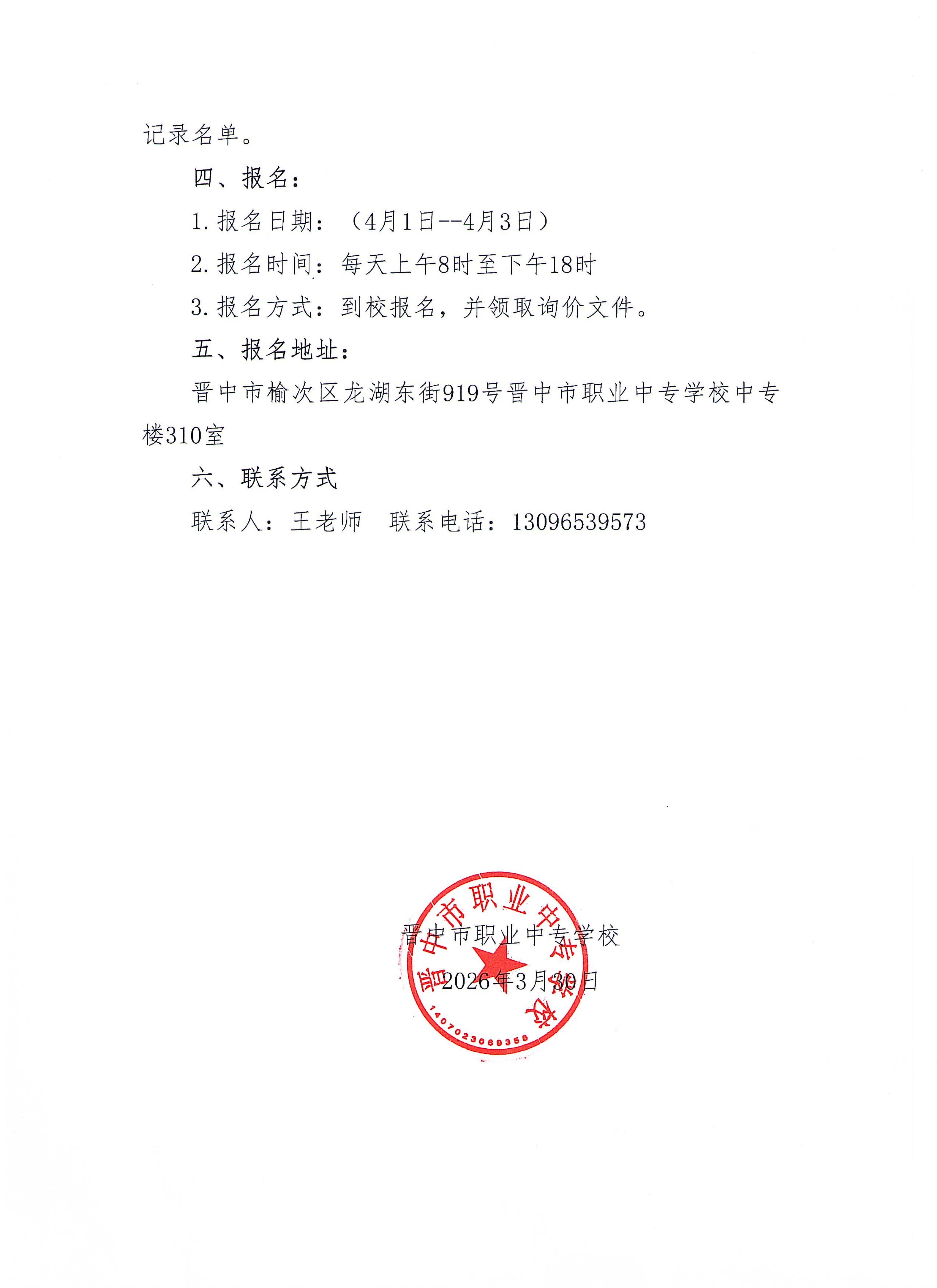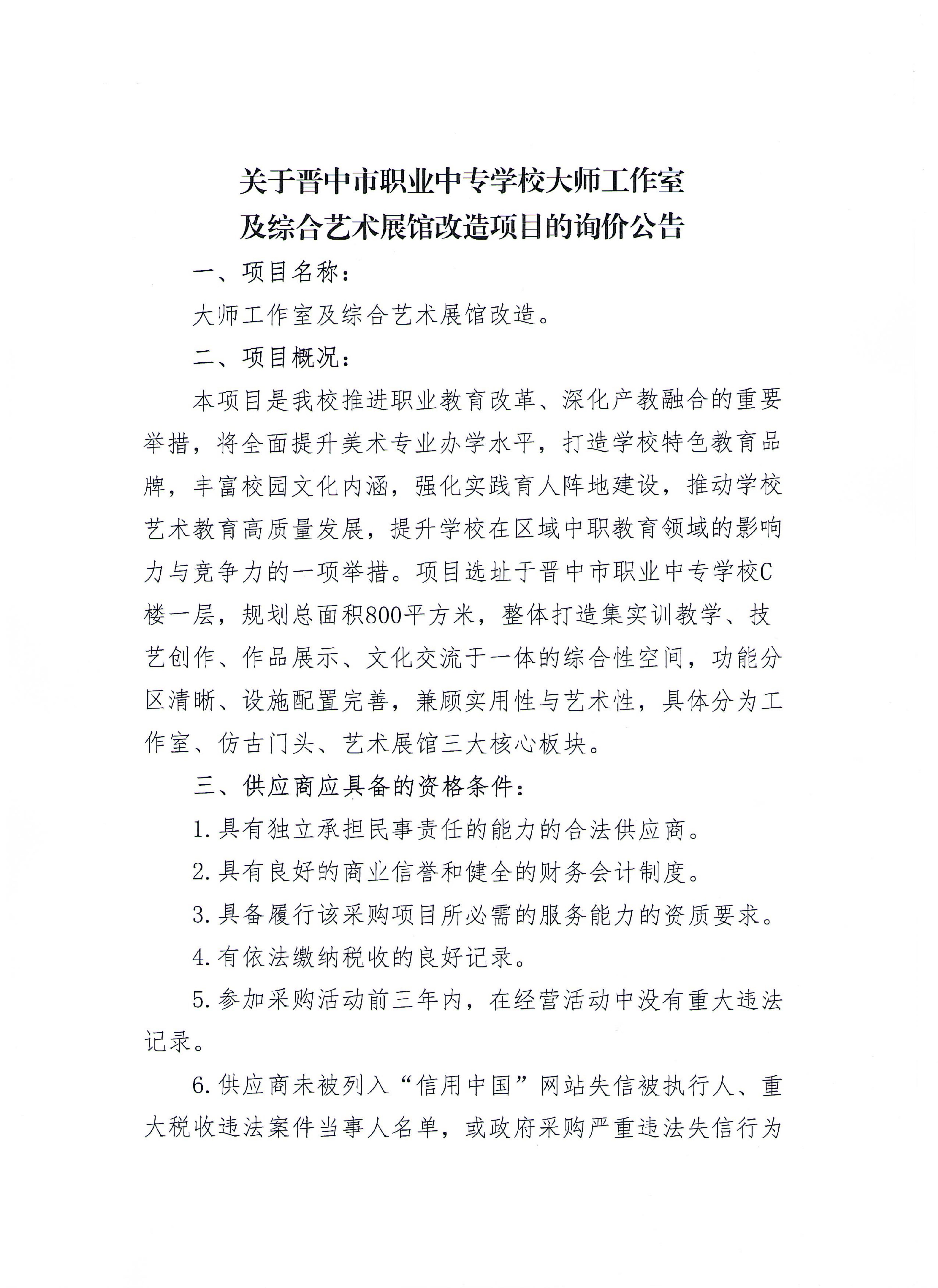 晋中市职业中专学校大师工作室及综合艺术展馆改造项目的询价公告